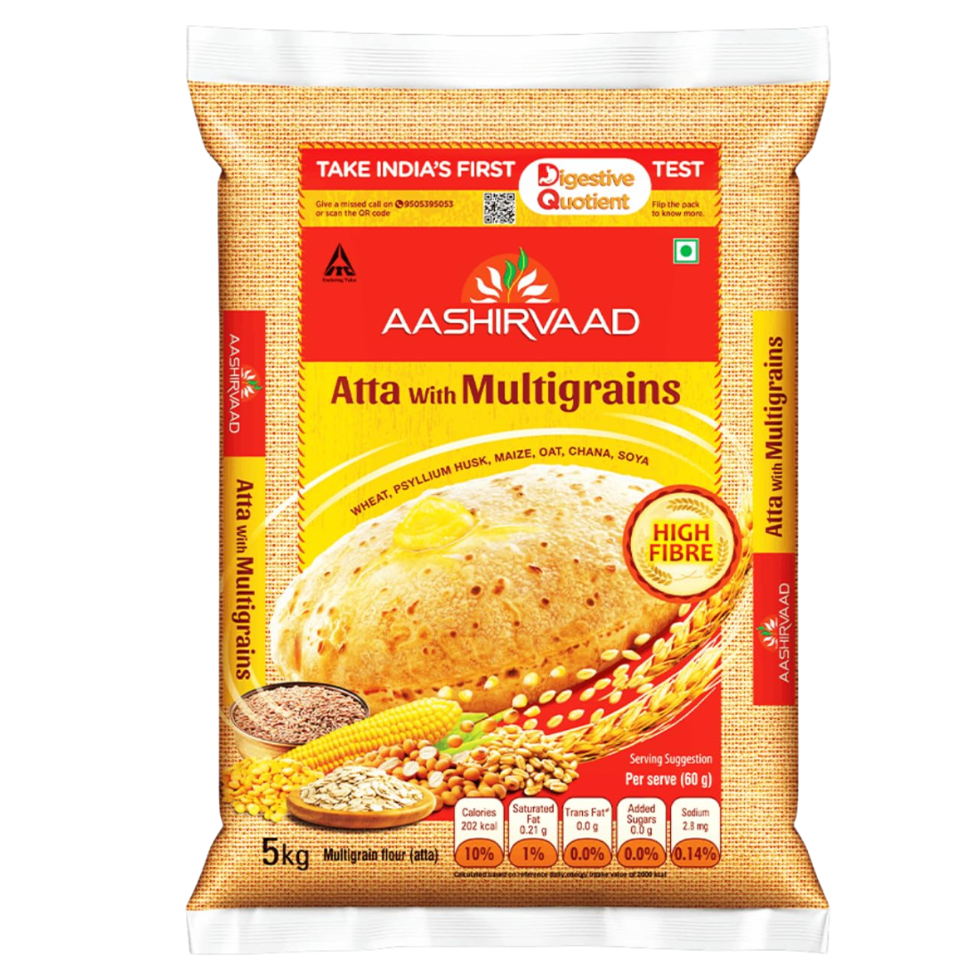 Aashirvaad Atta with Multigrains is a nutritious blend of wheat, oats, soy, chana, maize, and psyllium husk for added fibre and energy.