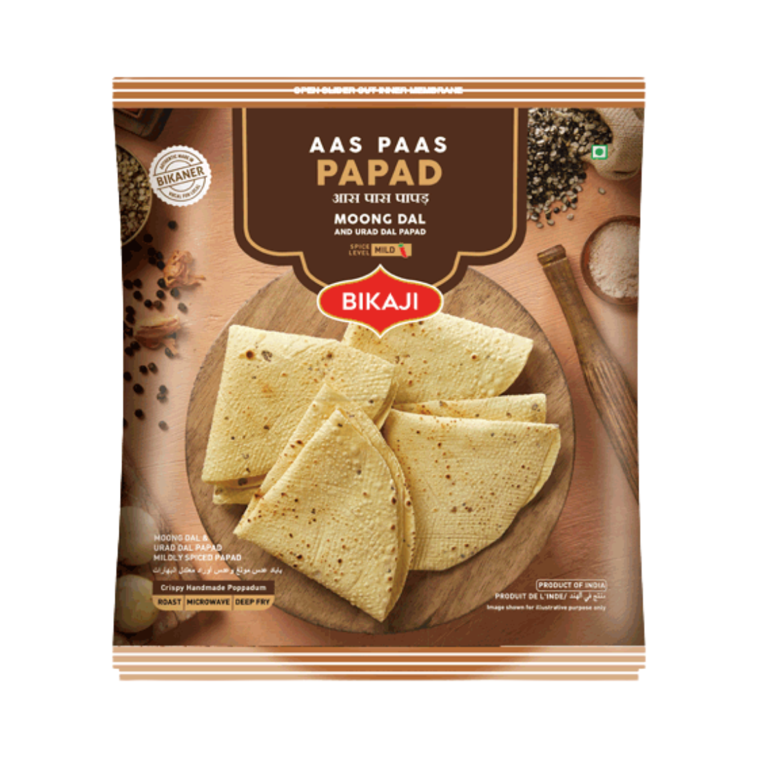 Bikaji Moong Dal & Urad Dal Aas Paas Papad is a flavorful papad crafted from a blend of premium moong and urad dal.