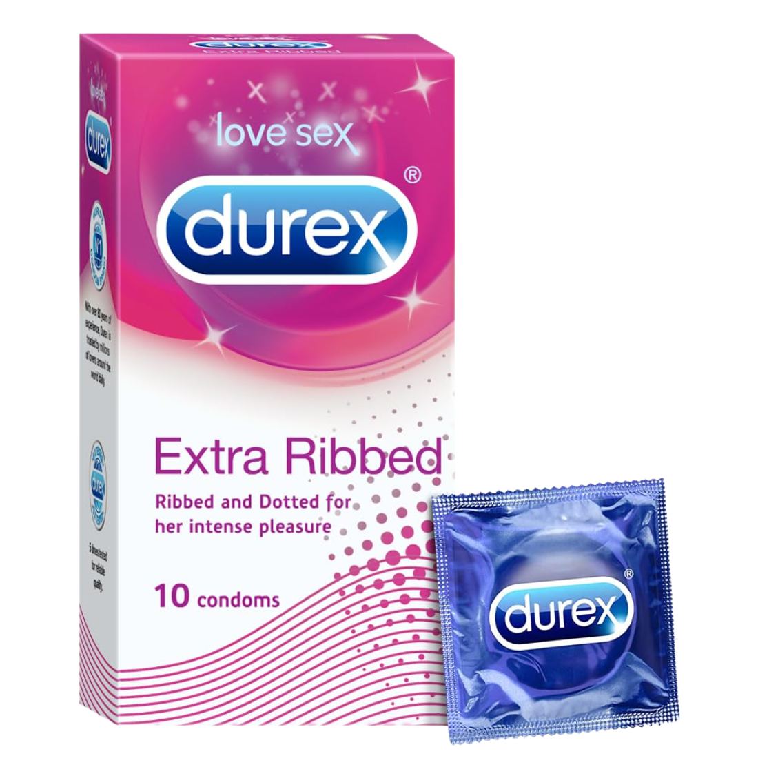Durex Extra Ribbed Condoms 10PC are designed with raised ribs for enhanced stimulation and pleasure for both partners.