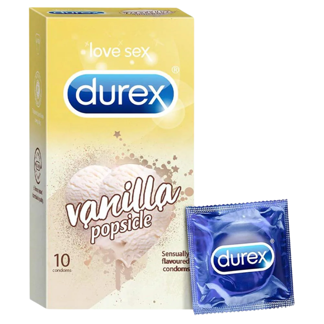 Durex Vanilla Popsicle Flavoured Condoms 10PC offer a fun, sweet vanilla flavor to make intimacy more playful.