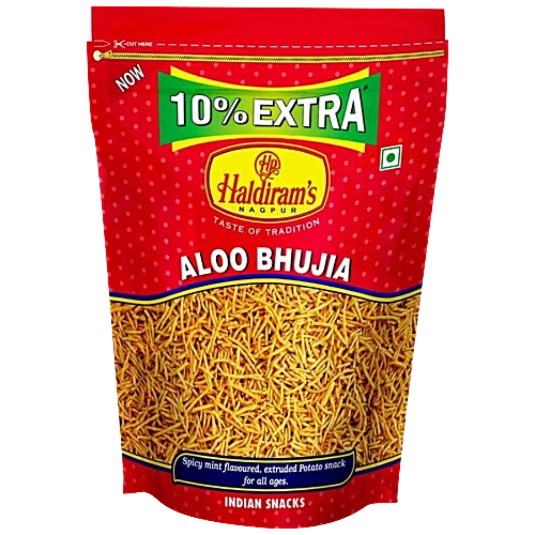 Haldiram’s Aloo Bhujia is a crispy, spicy potato-based snack made with traditional Indian spices.