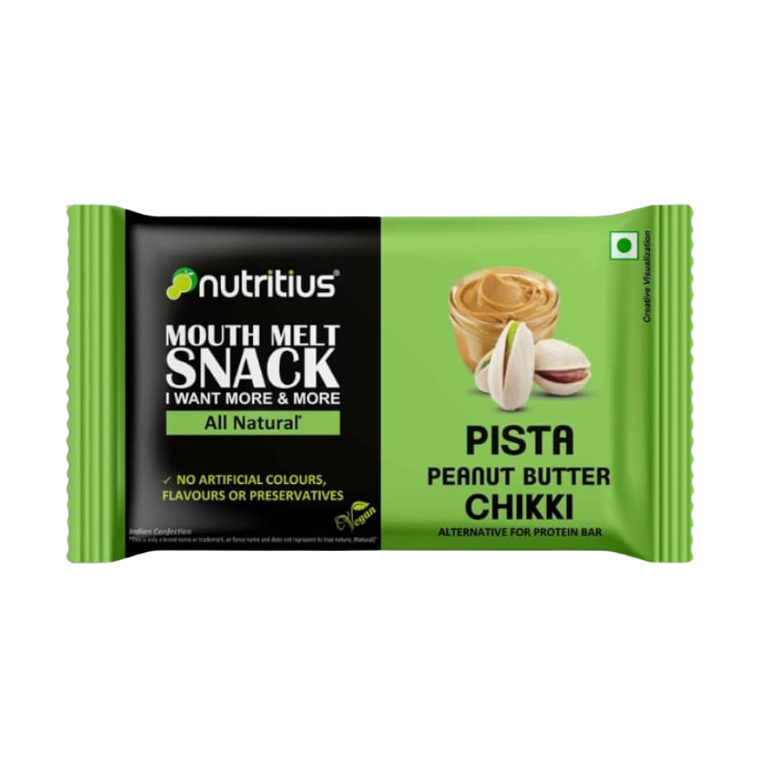 Nutritius Pista Peanut Butter Chikki 125GM blends rich pistachios and roasted peanuts with creamy peanut butter for a flavorful premium treat.