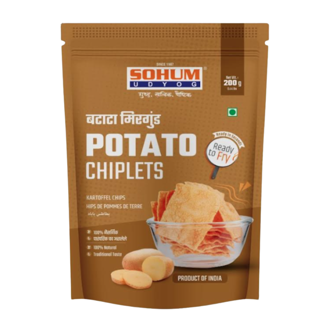 Sohum Udyog Potato Chiplets 200gm are crispy, thinly sliced potato snacks perfect for munching anytime.